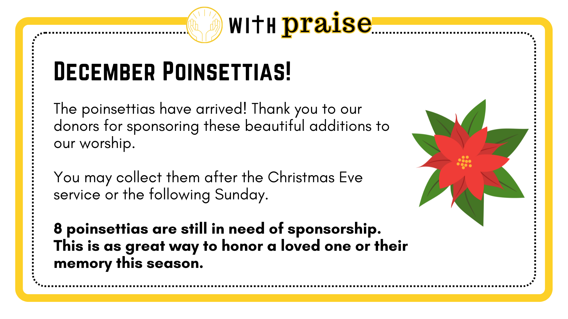 poinsettia for Christmas Eve? Opportunities abound for spreading the joy and wonder of Christ’s love through your gifts of time, treasure, and talents. Tempting, isn’t it?