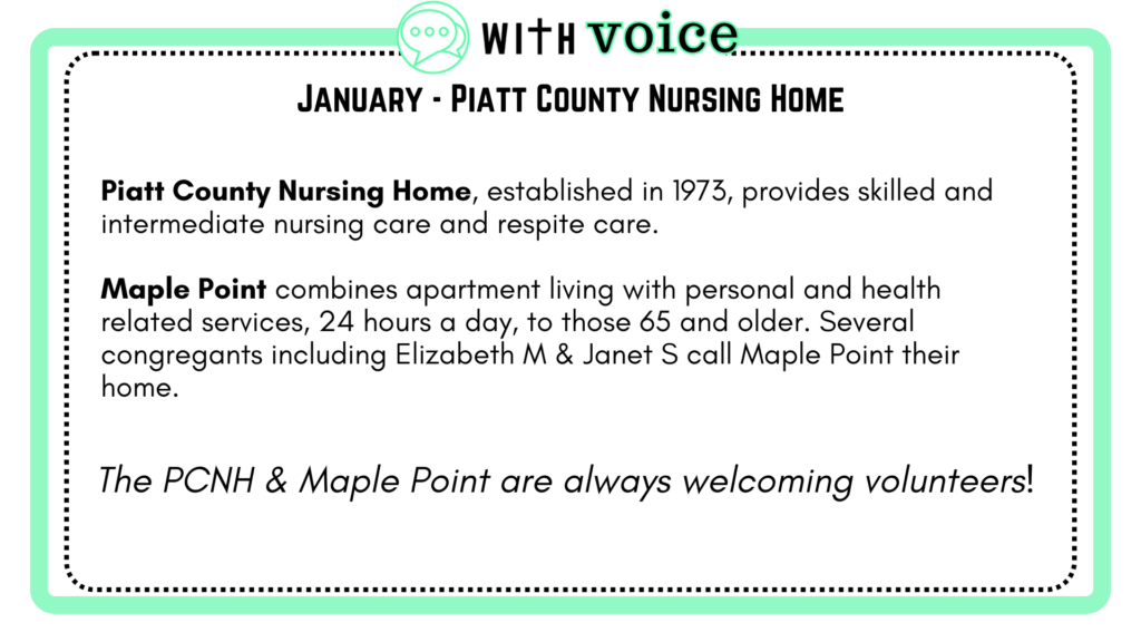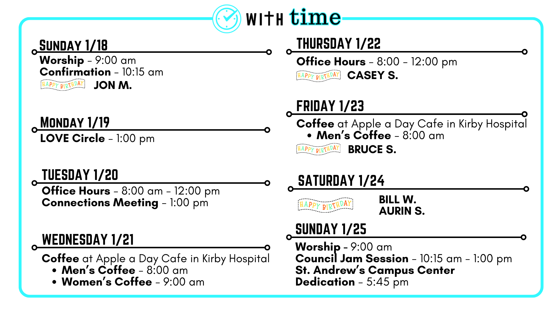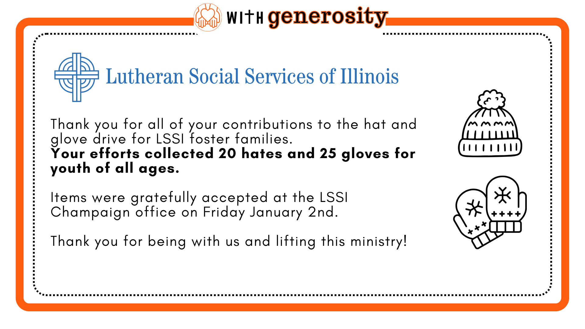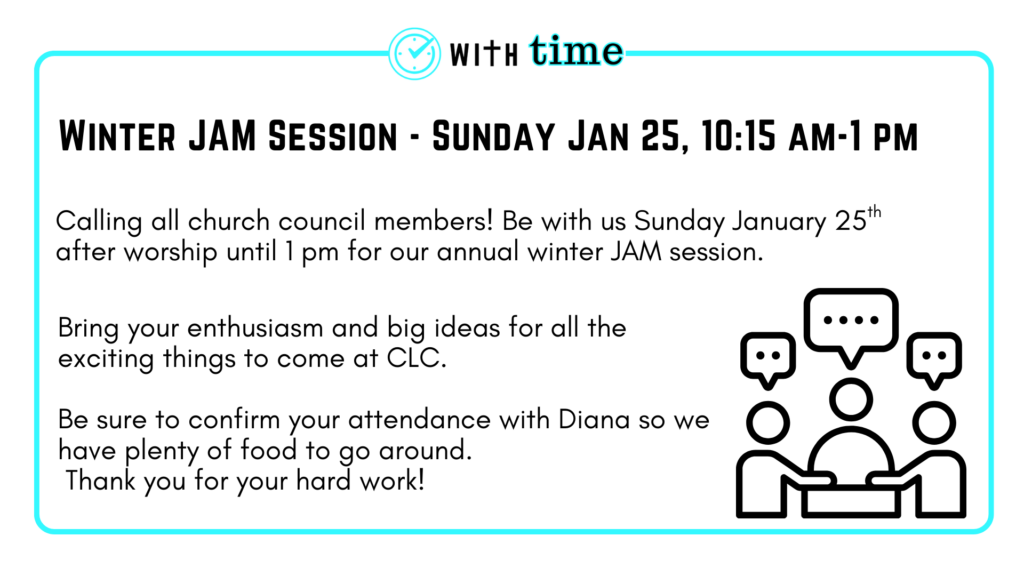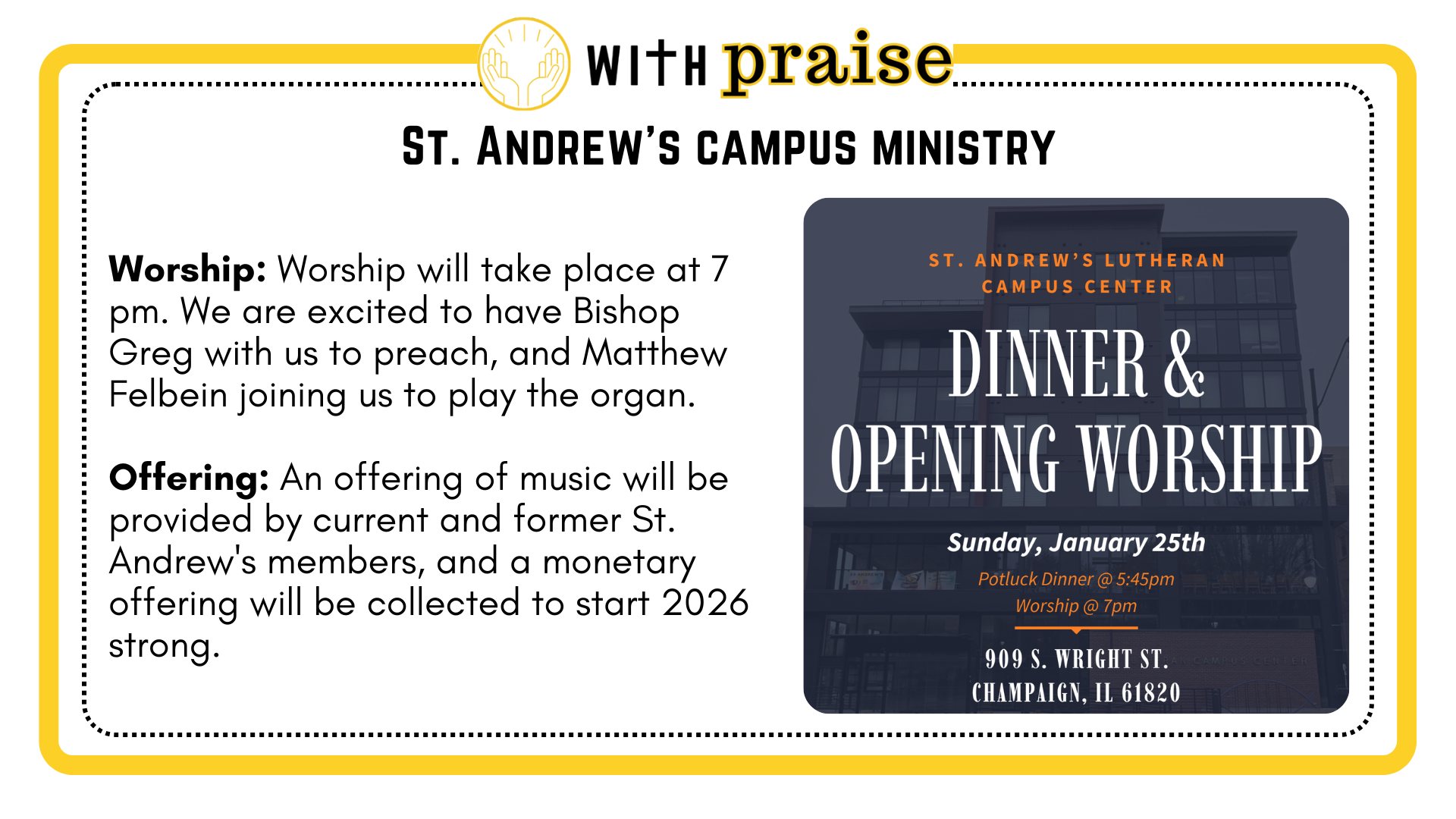Slow down and take a deep breath. That’s what we do in January, isn’t it? Yet our worship, thanksgiving, and praise continue through the quieter days of winter. Join us for the congregational meeting on January 11, celebrating the vibrant life of Christ Lutheran Church as we move into the new year. Two weeks later, everyone is invited for a tour, dedication, and potluck dinner at the new St. Andrew’s facility on the University of Illinois campus. Connect with the youth of our church through Partners WiTh Prayers. Breathe deeply. Slow down. Rejoice. Be present.