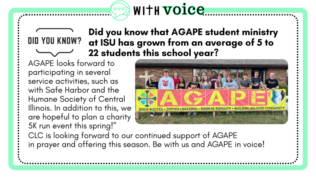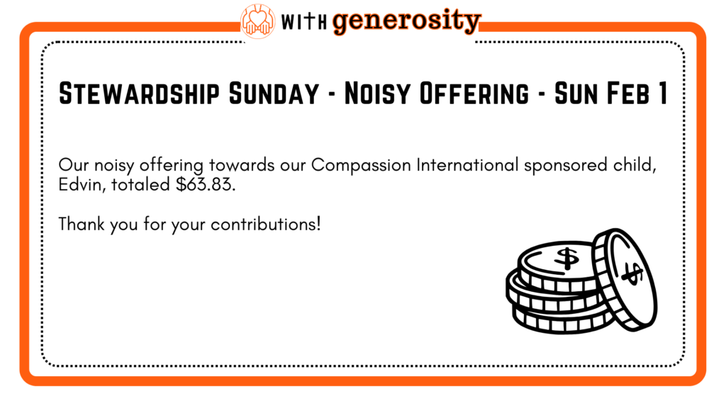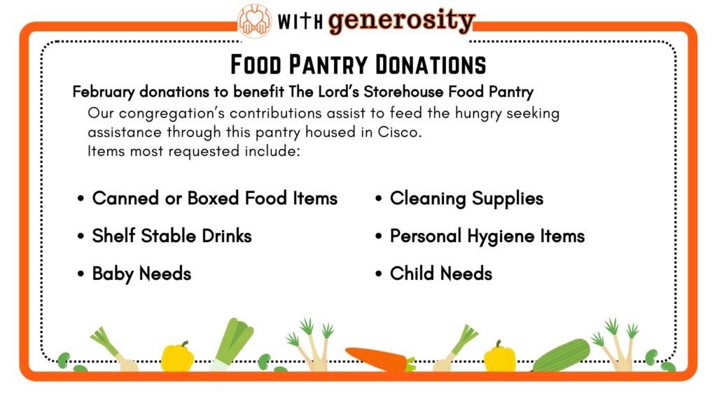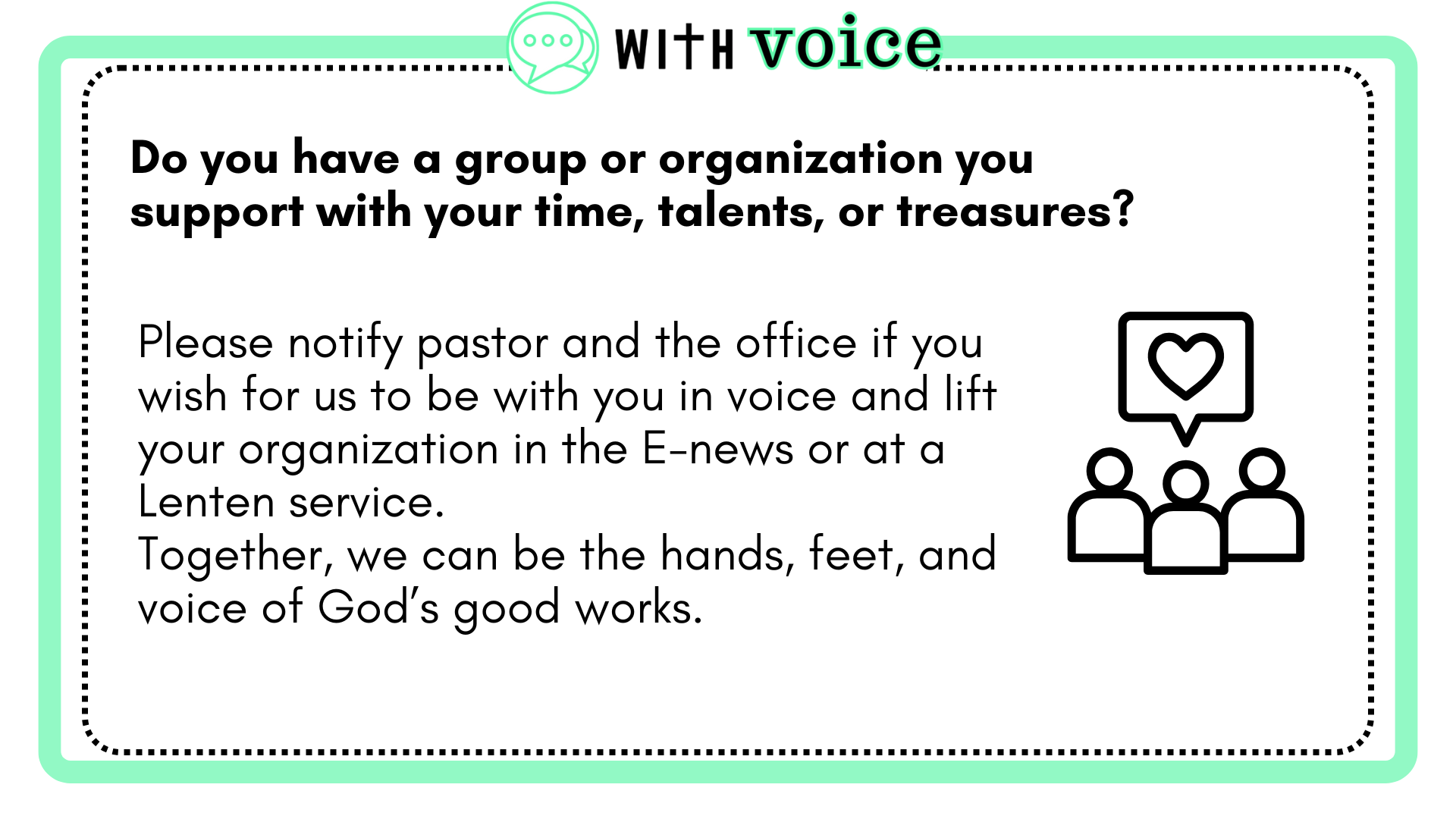 February begins our quarterly stewardship theme of Voice. Listen! The clank of coins tossed in a bucket, the thump of canned goods placed in the food pantry bin, the squish of a paint roller swooping across a wall, the murmur of prayers and crescendo of conversations ….the sounds of action. Your voice, our voices, together translate into actions that make a difference. Opportunities abound. Let’s make some noise!
